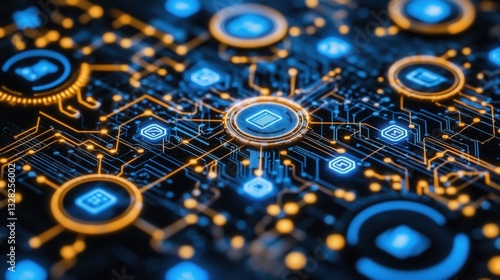 © Idea Library, Fototapeta premium High-tech circuit board featuring a bright blue light illuminating the intricate electronic components