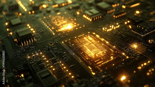 © HENNYSURYA, Fototapeta premium High-tech circuit board glowing with golden light