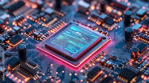 © basketman23, Obraz premium High-Tech Circuit Board with Glowing Chip