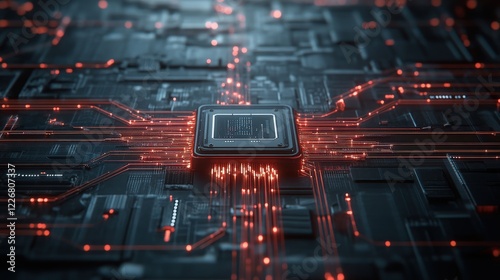 Obraz premium High-Tech Circuit Board with Red Light and Microprocessor Details