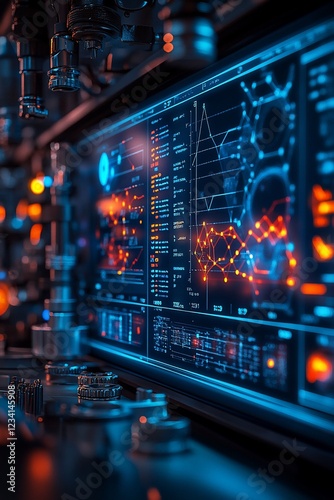 © MUMTAZ, Obraz premium High-tech control panel displaying vibrant data visualizations and graphs in a modern lab