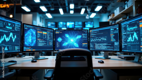 © Tameem, Fototapeta premium High-tech control room with multiple monitors displaying advanced data graphics, showcasing bot integration technology.