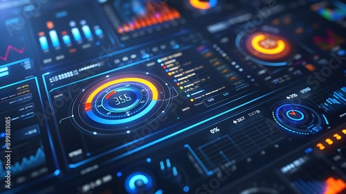 Obraz premium High-tech dashboard with rotating 3D graphs