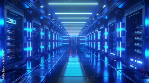 Fototapeta premium High-Tech Data Center with Blue Neon Lights, Generative AI