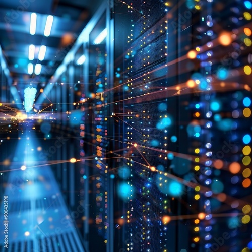 Obraz premium High-Tech Data Center with Interactive Network Visualization