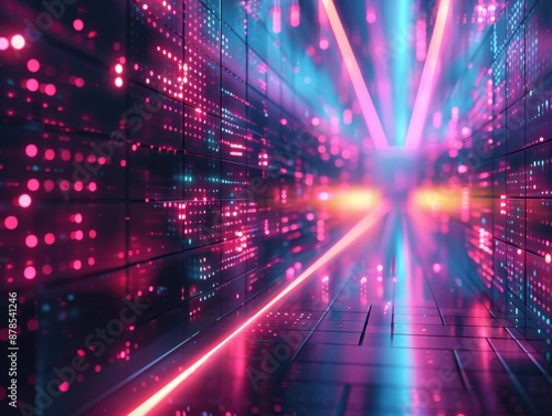 Obraz premium High-tech digital background featuring geometric grids, neon lights, and data streams, perfect for technological workflow presentations