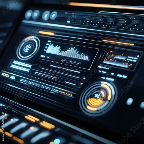 Fototapeta premium High-tech digital dashboard interface with graphs, charts, and data visualization for futuristic technology and software applications.