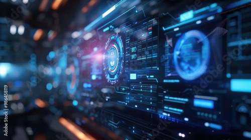 Fototapeta premium High-tech digital interface featuring a holographic display with neon blue...