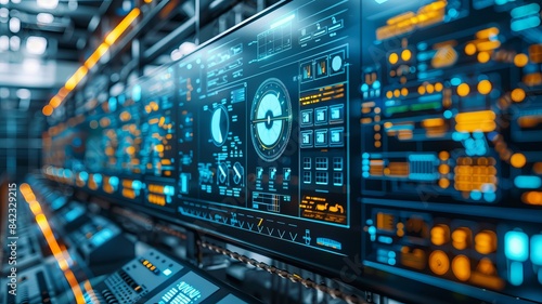 Obraz premium High-tech digital interface with futuristic design, data visualization, and control panels in a technology and data center setting.
