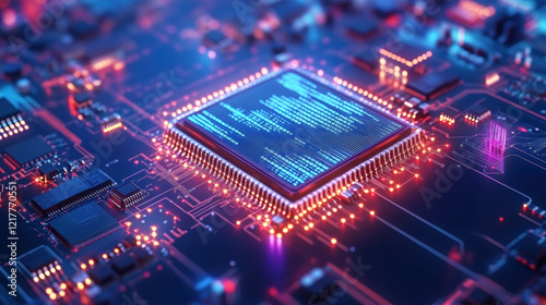 Obraz premium High-tech digital landscape with 3D rendering of microchips, binary code,...