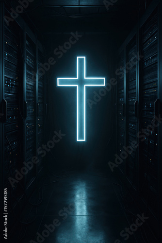 Naklejka premium High-tech hallway with radiant Christian crossSpiritual light in a dark digital environment