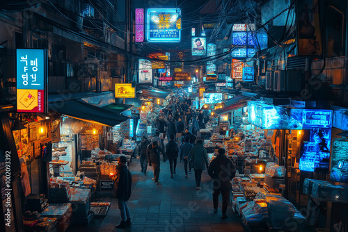 Naklejka premium High-Tech Hustle at a Neon-Lit Cyberpunk Street Market