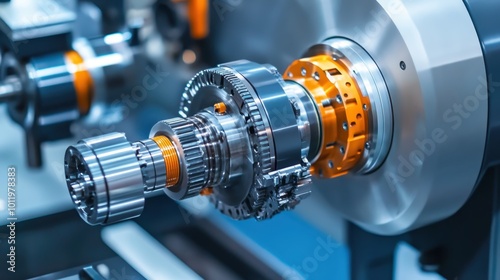 Fototapeta premium High-tech industrial machinery working with precision, producing components for cutting-edge technology.