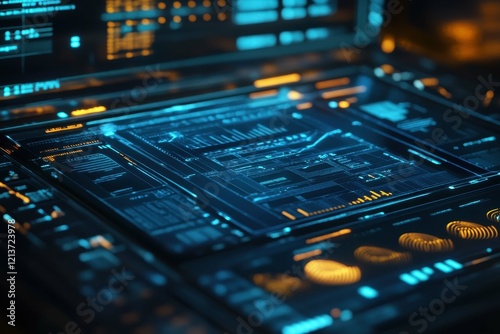 © Tanu, Obraz premium High-tech interface displayed on futuristic computer screen showing data analysis and digital graphics
