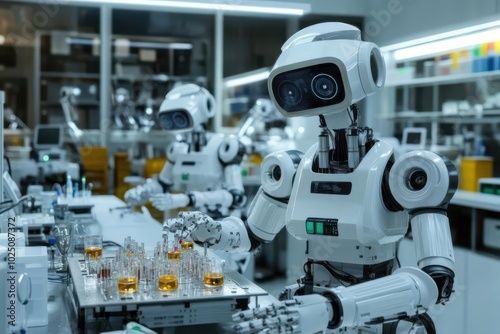 Fototapeta premium High-tech laboratory with multiple robotic assistants testing new compounds,...