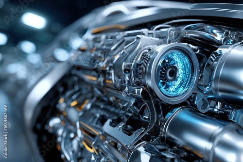 Fototapeta premium High tech mechanical engine equipped with advanced AI regulation in a futuristic automotive workshop