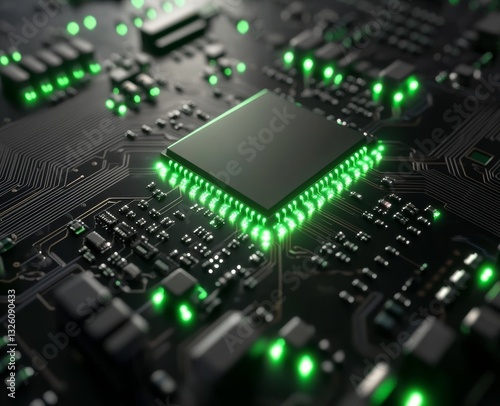 © rahmatjuadir, Obraz premium High-Tech Microprocessor Chip Embedded in a Complex Circuit Board with Glowing Green Connections, Exemplifying Modern Technological Advancement in Computing.