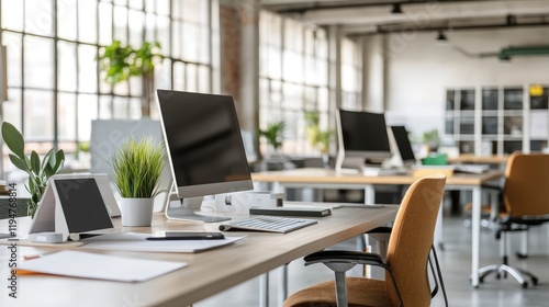 © pinporn manosri, Fototapeta premium High-tech office setup featuring dual monitors, a tablet, and wireless gadgets on a minimalist desk. Plenty of copy space.