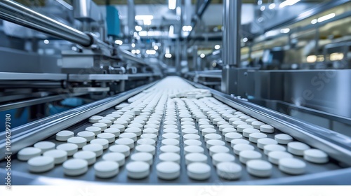© Lamina, Fototapeta premium High-tech pharmaceutical production line with stainless steel machinery producing white tablets from precision molds on a moving conveyor belt under sterile bright lighting.