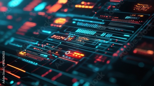 © 69, Obraz premium High-tech project planning with AI data integration, seamless task management in a glowing night interface.