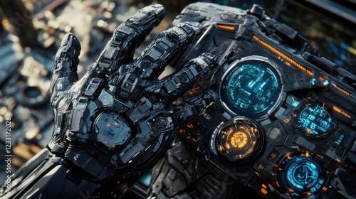 Fototapeta premium High-tech robotic hand interacts with futuristic control panel in advanced...