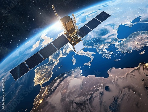 Obraz premium High-tech satellite in orbit focusing on digital enhancements over Europe