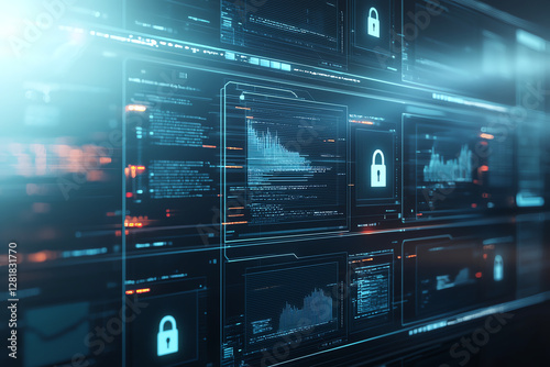 © Tondone, Obraz premium High tech security system with multiple screens displaying data and graphs. interface features lock symbols, emphasizing data protection and cybersecurity