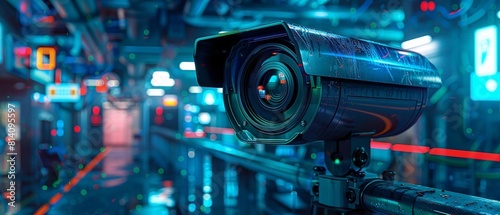 Fototapeta premium High-Tech Surveillance Room with CCTV Camera, Neon Lights, and Holographic...