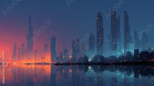 Fototapeta premium High-tech urban landscape featuring neon-lit skyscrapers stretching into a darkening dusk sky