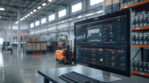 © Old Man Stocker, Naklejka premium High-Tech Warehouse with Logistic Analytics. Modern warehouse environment with a computer display showing logistic analytics, enhancing inventory and shipment management efficiency.