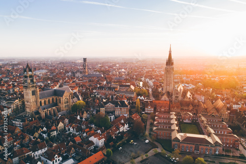 Fototapeta premium High top cityscape at sunrise. Church of Our Lady Bruges, Belgium.