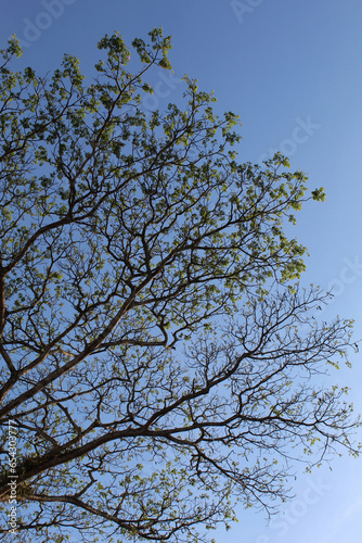 © Yessi Frenda, Obraz premium High trees, view from below, with clear blue sky background