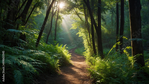 © Anuyj, Fototapeta premium High view of dense green forest morning sunlight