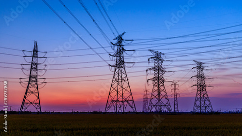 © ABCDstock, Fototapeta premium High voltage electricity tower sky sunset landscape,industrial background.