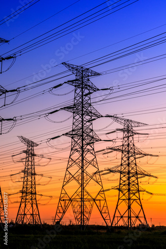 © ABCDstock, Fototapeta premium High voltage electricity tower sky sunset landscape,industrial background.