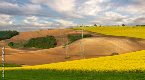 © Mike Mareen, Obraz premium High voltage line poles running through Moravian fields