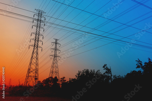 © teerapon, Fototapeta premium High Voltage Poles on the orange sky Concept of electric power