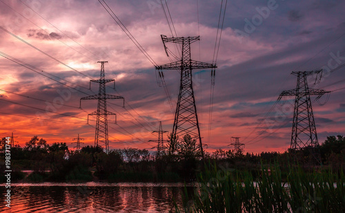 © Lumppini, Fototapeta premium high-voltage power lines at sunset.