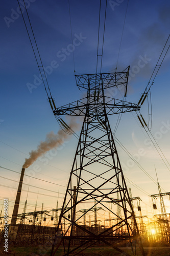 Fototapeta premium High voltage power tower beautiful scenery at dusk