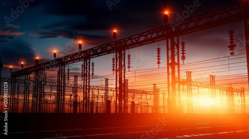 © Jack, Obraz premium High-Voltage Transmission Lines at Sunset with a Dramatic Sky.