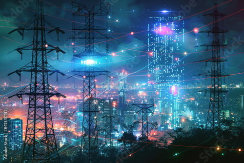 Fototapeta premium high voltage transmission towers with line data hologram with city background