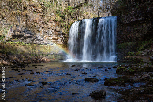 Obraz premium High waterfall with a rainbow in its mist, Sgwd Yr Eira, Brecon Beacons, Wales