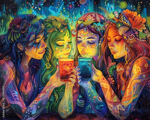 Fototapeta premium Highdetail image of friends sharing drinks at music festival, happy moments, intricate background, lively crowd, Midjourney creation