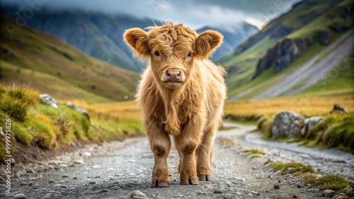 © suchetpong, Fototapeta premium Highland calf standing on trail with mountain grass in background