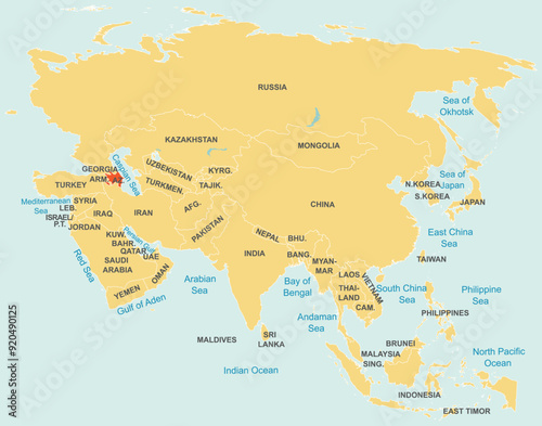 © Sanja, Fototapeta premium Highlighted map of AZERBAIJAN inside detailed blank flat political map of the Asian continent on isolated background