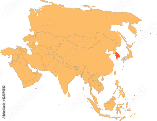 © Sanja, Fototapeta premium Highlighted red map of SOUTH KOREA inside orange detailed political map of Asia using orthographic projection on transparent background
