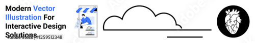 © robu_s, Fototapeta premium Highlighting a storefront illustration, minimalist cloud line, and a black-white anatomical heart. Ideal for design, branding, e-commerce, education, health, technology artistic projects flat