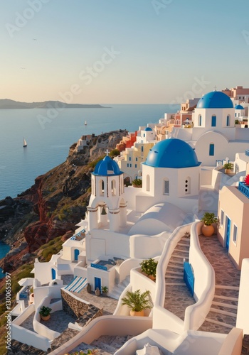 Fototapeta premium Highly Detailed 3D Illustration of Santorini: White-Washed Buildings with Blue Domes on Cliffside, Overlooking Aegean Sea in Golden Sunlight
