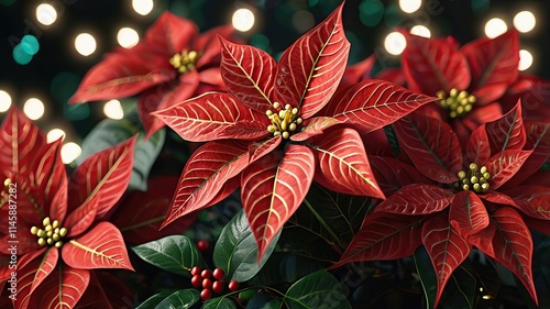 © Jedo, Naklejka premium Highly detailed 3D model of festive poinsettia flowers surrounded by glowing Christmas lights.