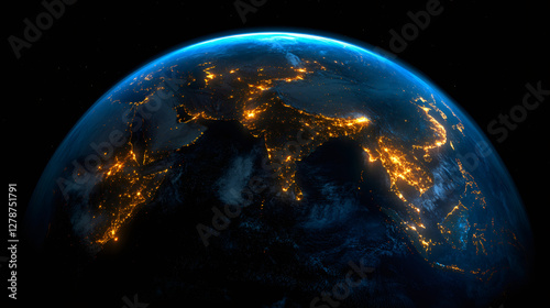 Fototapeta premium Highly detailed Earth showing city lights at night over Asia and India, revealing human impact on the planet